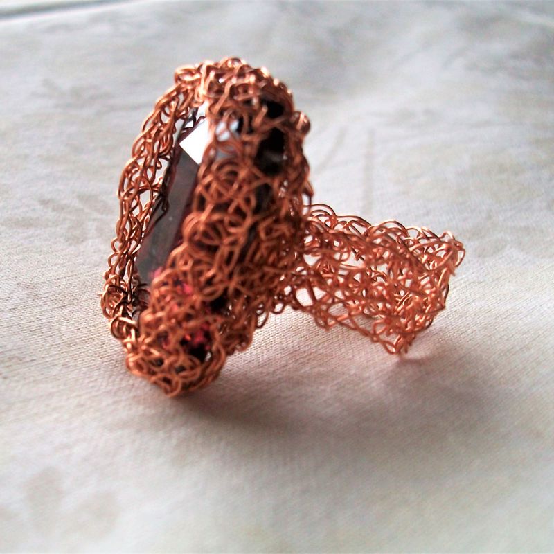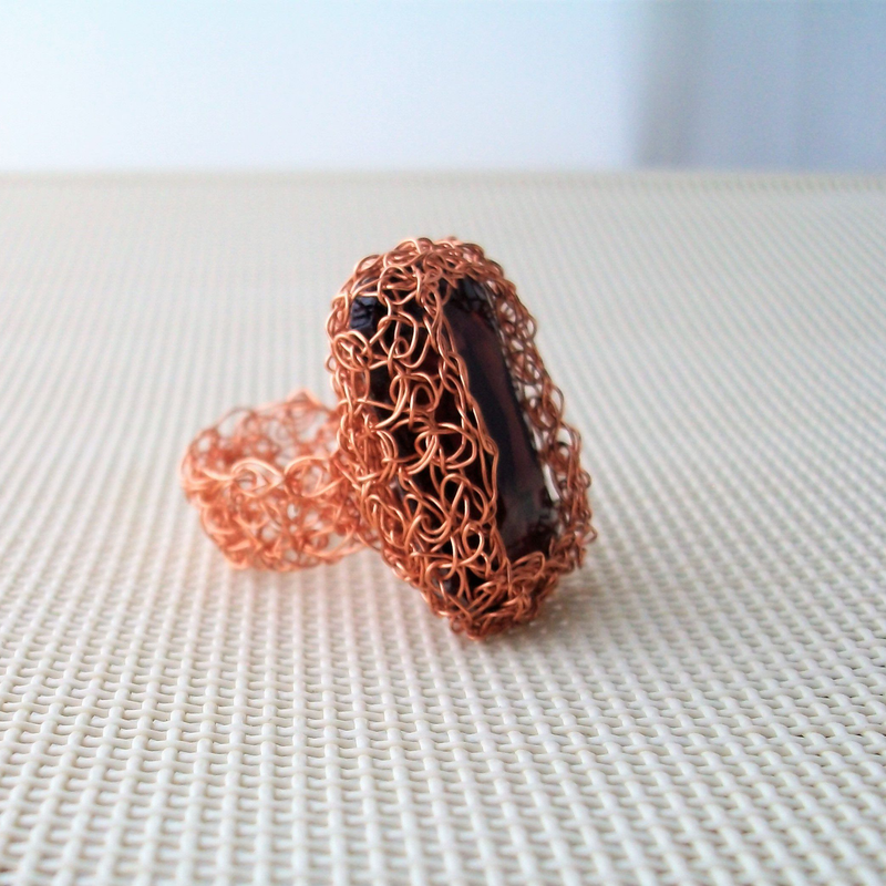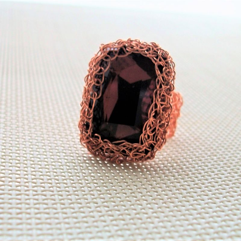 Wire knitted ring with light brown crystal bead. All crochet jewelry is created using a malleable artistic jewelry wire. My crochet rings come in a single size, as they can be easily adjusted to fit any ring size by slightly stretching/squashing. Therefore they are perfect for a gift, fitting a wide range of ring sizes!
