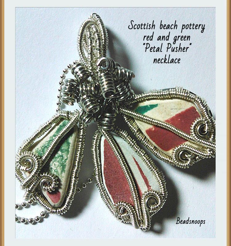 Wire wrap weave-Red and Green Scottish beach pottery "Petal Pushers" necklace