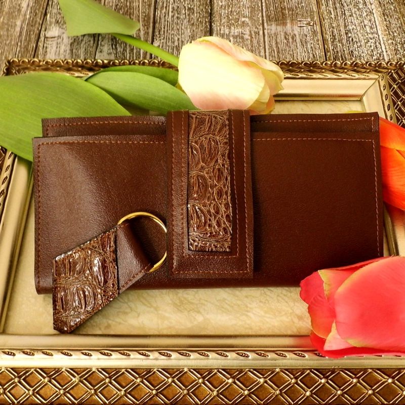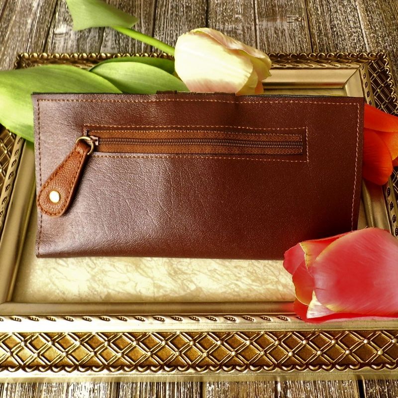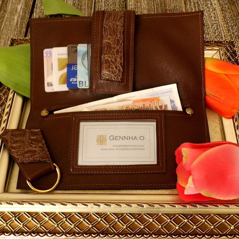 This ladies dark brown wallet and key fob set is made from vegan leather. This bi-fold design with magnetic closure will accommodate all your daily essentials. There are several pockets for your money, cards, and coins. Approximate size: (H): 5" x (W): 8 ½" Available from my Etsy shop: https://www.etsy.com/listing/549460612/vegan-leather-wallet-ladies-brown-wallet?ref=shop_home_active_5 Please contact me if you have any questions. www.etsy.com/shop/Gennhaio
