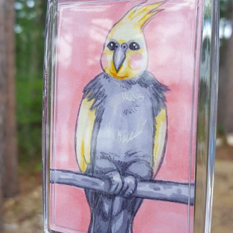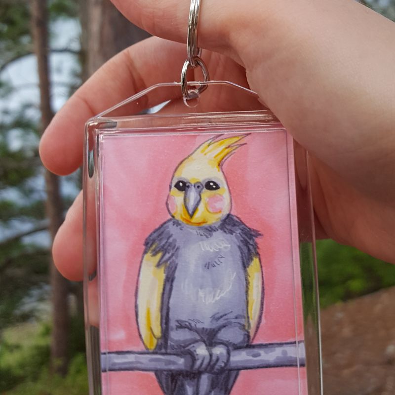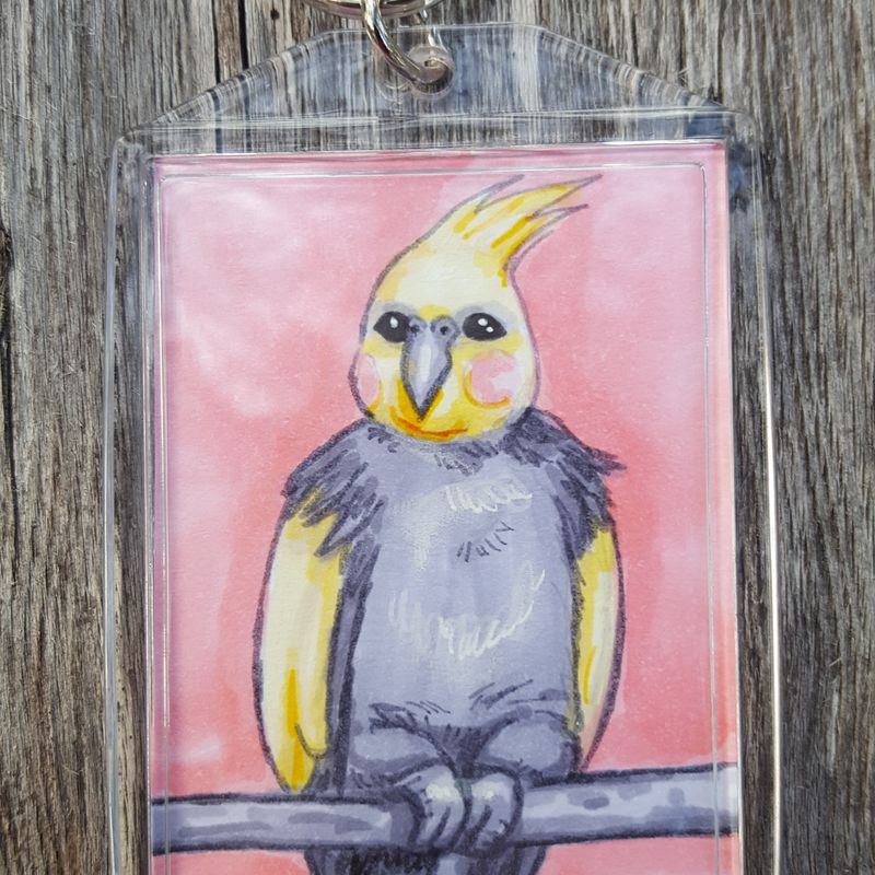 Feel stylish and show your love for cuteness and cockatiels with this acrylic keychain! This is a perfect gift for pet owners or bird lovers! Each 2x3 portrait is drawn by hand in alcohol-based markers and pens and then sealed into the photo keychain, so some slight variations may occur. They are all handmade copies of an original portrait I did of a coworker's beloved cockatiel, Yvonne. | Customization exists in that you can request a different color background - at no extra cost - than the pink shown here. Please just specify in a note if you would like a certain background color, and I'll take care of accommodating you. For an additional $1, you can have a sturdy steel swivel clip added to the key ring.