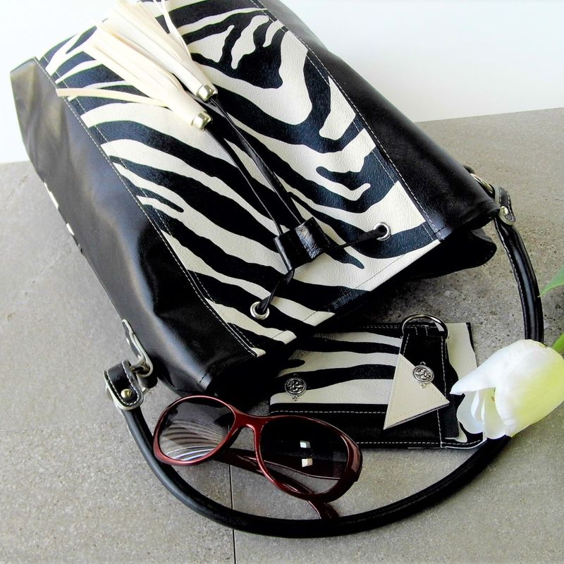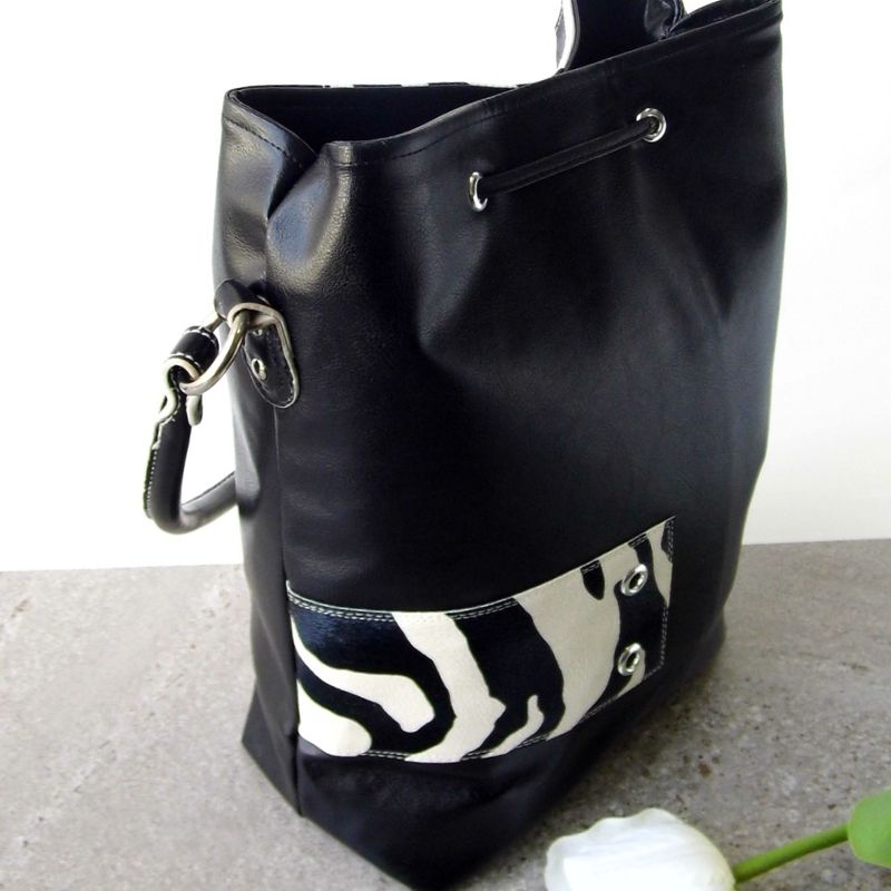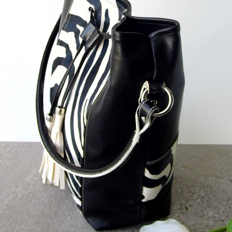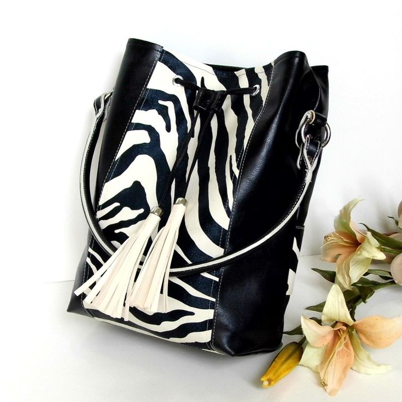 Zebra handbag, Zebra print handbag, Vegan handbag women, Black bucket bag, Animal print handbag, Drawstring bucket bag, Handbag with tassel