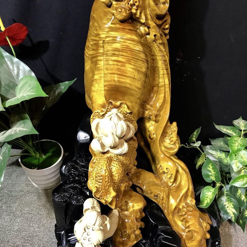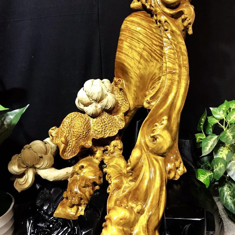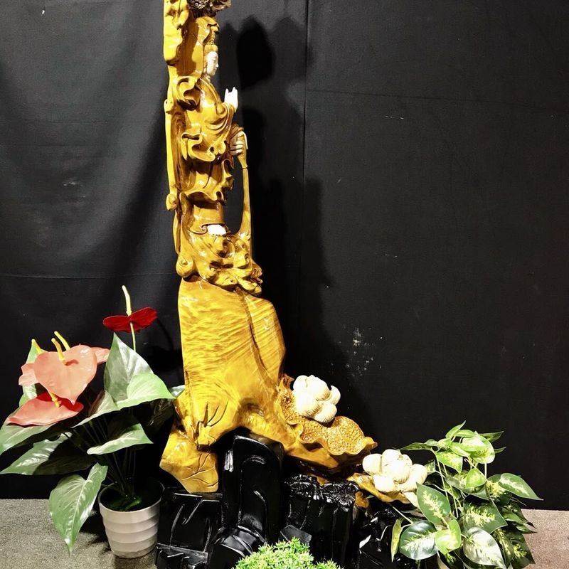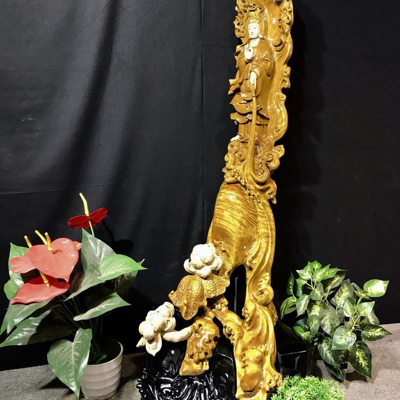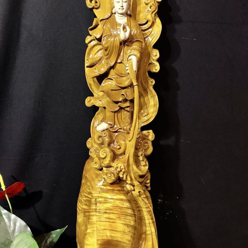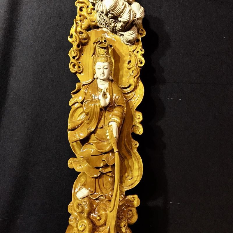 Material: Zhen Nan Size: length 43cm, width 50cm, height 119cm The layout is elegant and graceful, Guanyin's posture is elegant. It gives visitors the enjoyment of beauty, and at the same time highlight the supernatural status of Guanyin. It means that life is safe and pure. The collectors will also be blessed.
