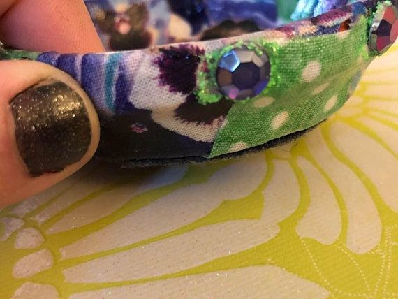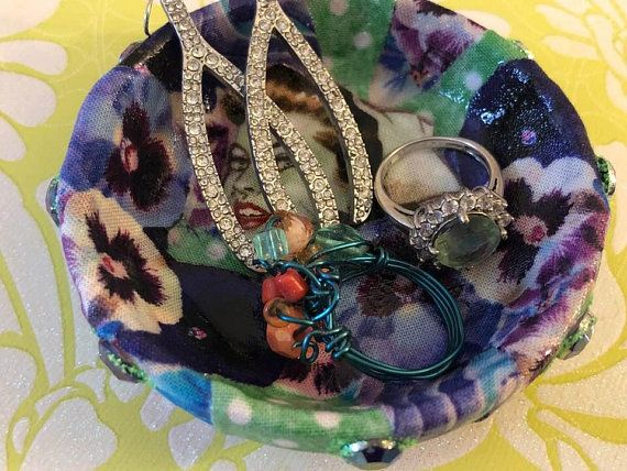 3 1/4 inch diameter dish. I absolutely love this zombie pinup nurse. I nested her in violets, and added purple acrylic gems with green glitter to the outside. Keep on... *vanity for cosmetics/perfumes/jewelry *sink to hold rings while showering or washing dishes *front table to park keys *corral any and all pretty little things Don't submerge in water or use for food. To clean (if necessary) just damp cloth it :) Trinket dishes are ceramic that I've decoupaged with leftover pieces from other projects, and sealed with acrylic. Everyone who has been in my studio knows I can't part with even the smallest bit of cute paper or fabric if it can be used for another beautiful thing. I adore decoupage because its so unpredictable, I never know how it will turn out at the end. If you love your décor chaotic, kooky colored, randomly textured, and entirely one-of-a-kind, my dishes are definitely for you <3